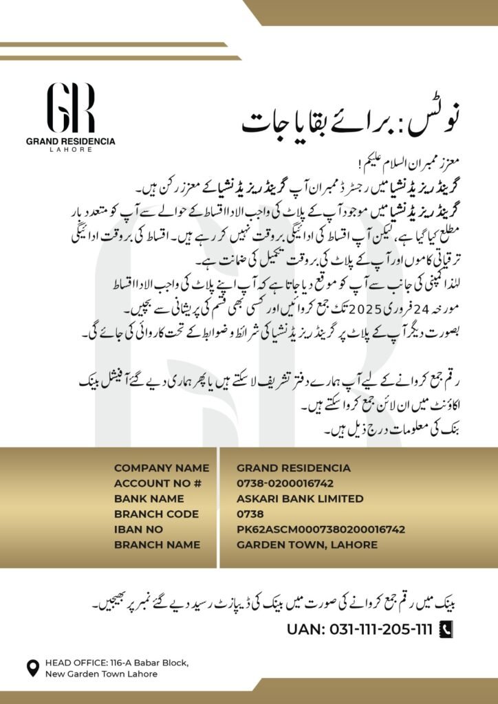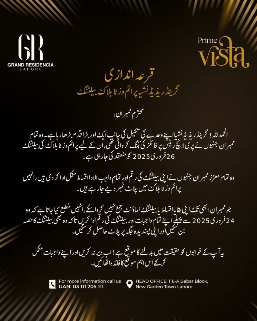 If you are a member of Grand Residencia’s Prime Vista Block, now is the time to ensure your eligibility. Clear your dues before 24th February 2025 and get ready to be part of this historic event. Don’t miss out on your chance to own a prime plot in Lahore’s most promising housing community.